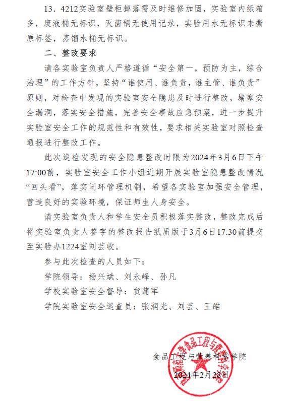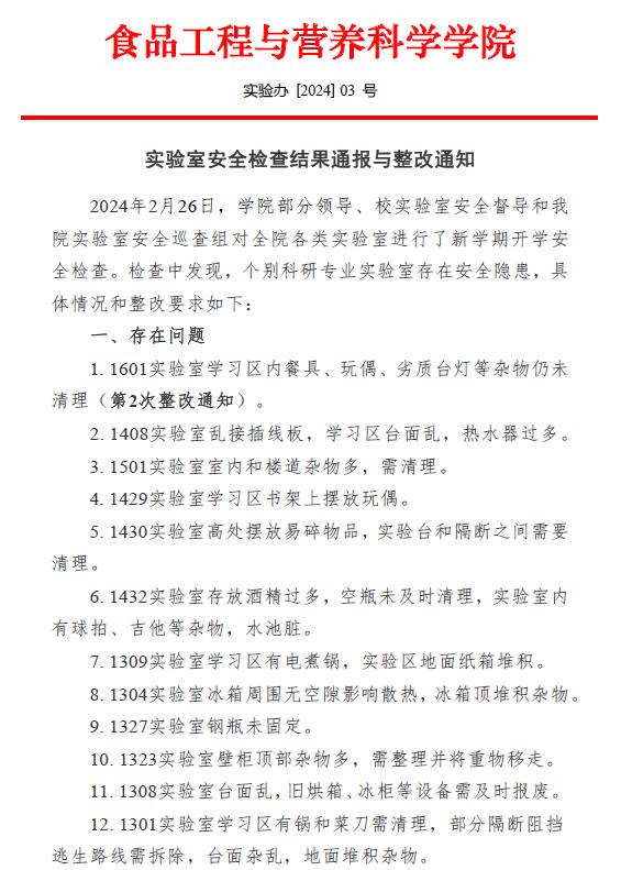 实验室安全检查结果通报与整改通知[2024]03号
