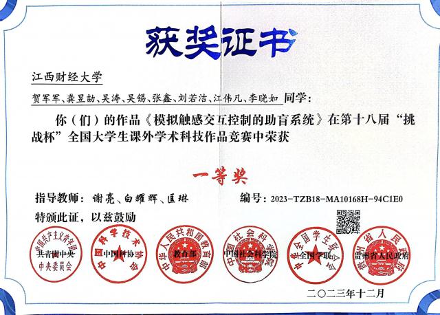 其中,2018年,学院学生科创团队在与北京大学等名校团队的竞争中脱颖而出,为学校取得“创青春”全国金奖零的突破;2019年,学院学生科创团队以全国本科第一名的成绩,与清华大学博士生团队并列获得第十六届“挑战杯”科技发明类特等奖,这是挑战杯办赛30年以来,江西省高校中“挑战杯”科技发明类全国特等奖零的突破,也是全国财经院校科技类全国特等奖零的突破;2021年,学院学生科创团队获第七届“互联网+”全国银奖,为江西财经大学取得中国国际“互联网+”大学生创新创业大赛的历史突破。2023年,学院学生科创团队以江西省第一顺位获“挑战杯”全国一等奖,并斩获中国国际大学生创新大赛一银一铜佳绩。2024年,学院学生科创团队作品《得芯应手》在第十四届 “挑战杯” 秦创原中国大学生创业计划竞赛(原 “创青春”)中再次斩获国家金奖。学院“金字招牌”——谢亮老师指导的“芯创客”学生竞赛团队7次入围“挑战杯终审决赛,取得教育部A类竞赛榜单赛事奖项80余项。