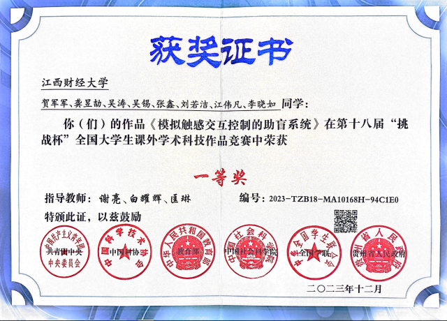 2023年,学院学生科创项目《模拟触感交互控制的助盲系统》获第十八届“挑战杯”全国大学生课外学术科技作品竞赛全国一等奖(在江西省高校所有国赛项目中排第一顺位,主题赛道国奖我校共3项,我院占1项)。被中国教育电视台《全国教育新闻联播》、江西教育电视台《教育新闻》详细报道。