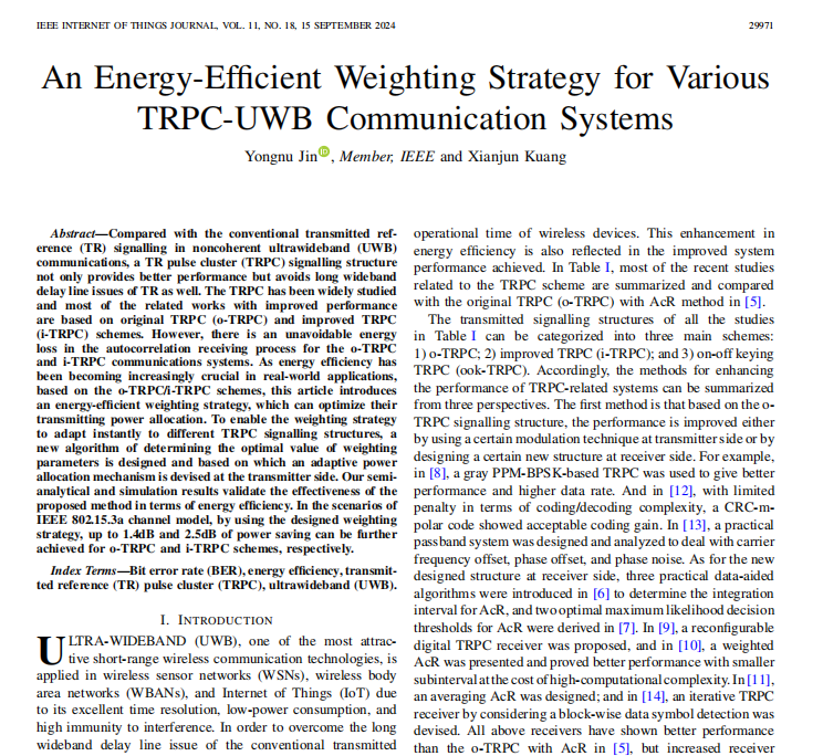 Recently,the paper An Energy-Efficient Weighting Strategy for Various TRPC UWB Communication Systems by Doctor JinYongnv of School of Software and Internet of Things Engineering, Jiangxi Univeristyof Finance and Economics, was published in IEEE Internet of Things Journal,a famous journal information sciences in the field of computer in formation systems.